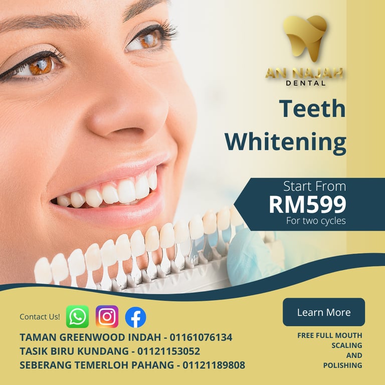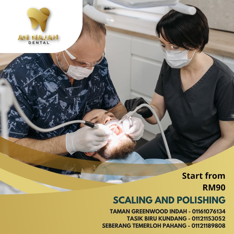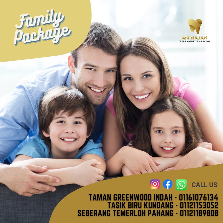 Klinik Pergigian AN NAJAH is a one stop center for your oral health needs. Our team will personalize your oral health care experience according to your oral health needs. We strive to practice painless dentistry. We want all our patient to feel at home with a positive atmosphere that are always welcoming you and make you feel relaxed. Our practice prides itself on providing the very finest level of service, from a simple filling to complex cosmetic dentistry.